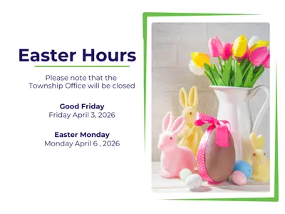 Please note that the Township Office will be closed Friday April 3 and Monday April 6 in celebration of Easter. Join us Saturday April 4 starting at 12:00 for our Easter Egg Hunt in Kaibuskong Park. Visit our Easter Egg Hunt page to learn more
