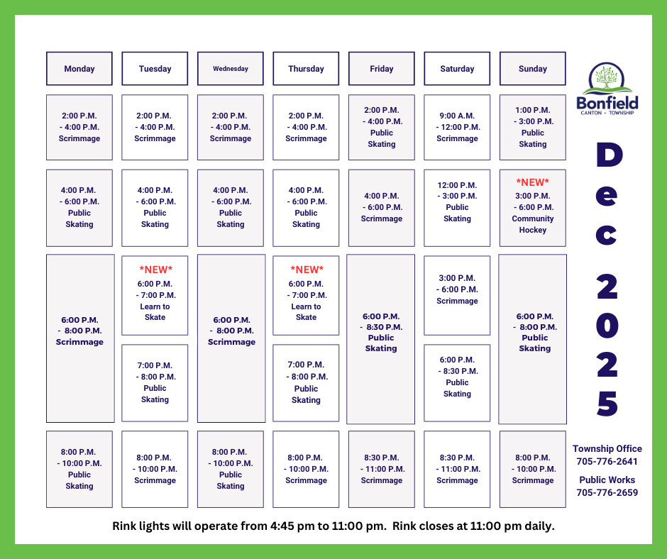 After long anticipation, the outdoor rink is officially open! Please use caution and keep an eye out for soft spots as warm weather is approaching again. Residents are reminded that shovels are in the change room to clear any excess snow that might accumulate on the rink. Please use caution and enjoy.