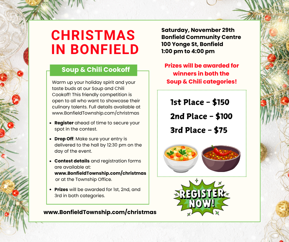 Register today and join us as we kick off the countdown to Christmas in style! Visit the Christmas in Bonfield page for details on the Soup & Chili Cookoff, as well as all the other festive activities taking place.